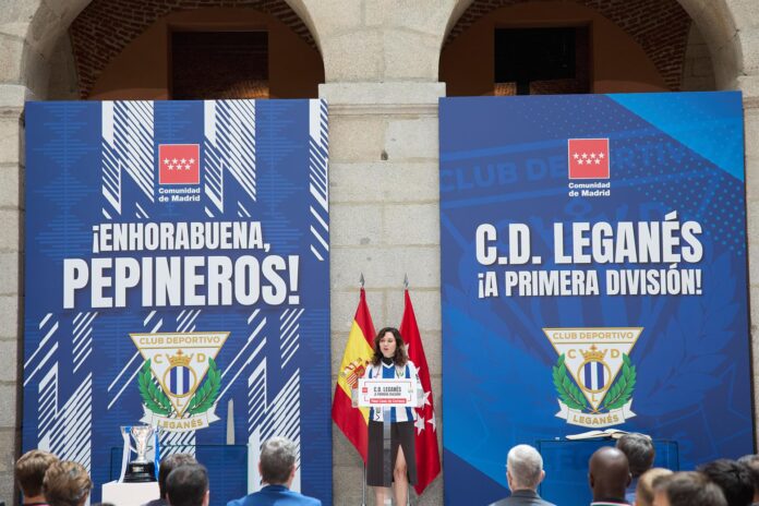 Ayuso incidió en el hecho de que gracias al ascenso del Leganés, la Comunidad de Madrid puede «presumir» de tener «cinco equipos en Primera División» –Real Madrid, Atlético de Madrid, Rayo Vallecano, Getafe y Leganés–. «El domingo se celebró en Butarque un partido que pasará a la historia de la ciudad y del fútbol madrileño. Miles de pepineros, niños, abuelos y jóvenes, todos enamorados de su equipo, celebraron juntos con el corazón en la mano, este triunfo», añadió.