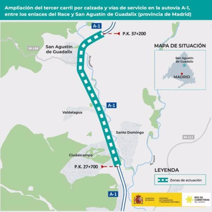 El Ministerio de Transportes y Movilidad Sostenible ha adjudicado por 3,3 millones de euros (IVA incluido) un contrato para la redacción del proyecto de trazado y construcción de la ampliación a un tercer carril por calzada en la autovía A-1, que incluye las vías de servicio, en el tramo entre los enlaces del RACE y el norte de San Agustín de Guadalix, en la Comunidad de Madrid.