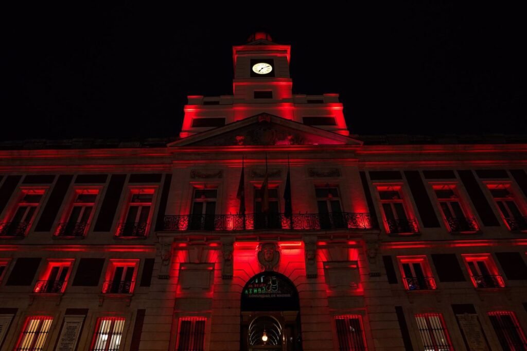 La fachada de la Real Casa de Correos, sede de la Comunidad de Madrid, se ha iluminado este viernes de color rojo para dar la bienvenida al Año Nuevo Chino que se inicia mañana.