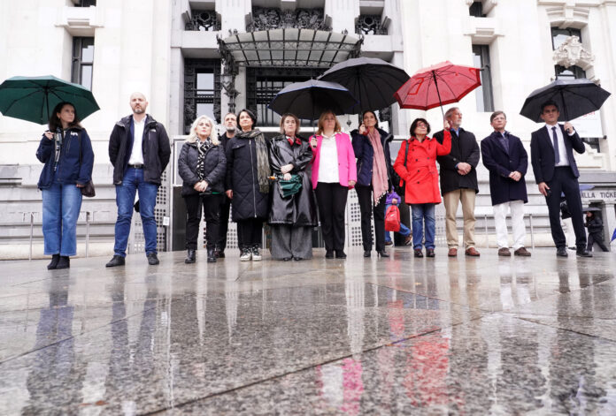 La vicealcaldesa de Madrid, Inma Sanz, junto a otros miembros del Gobierno municipal y representantes de los grupos políticos en el Consistorio, ha presidido este jueves un minuto de silencio frente al palacio de Cibeles en homenaje a los dos bomberos fallecidos en acto de servicio en el municipio de Alcorcón.