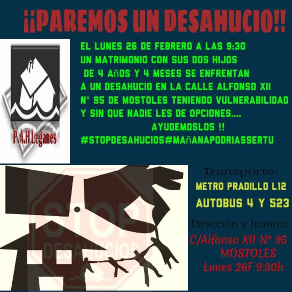 La Plataforma de Afectados por la Hipoteca (PAH) ha convocado una concentración para el lunes a las 9.30 horas en la calle Alfonso XII, 95, de Móstoles para evitar el desahucio de Danitza y Noel y sus 2 hijos menores.