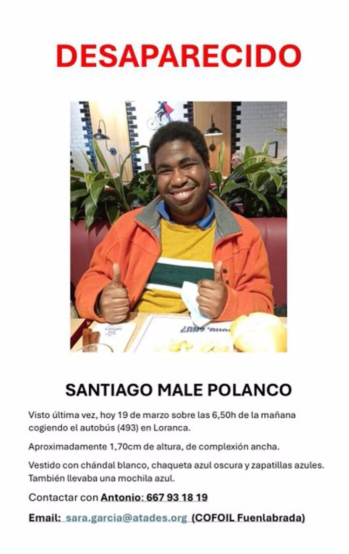 El desaparecido se llama Santiago Male Polanco. Es un hombre de mediana edad y de raza negra. Mide 1,70 metros de largo y tiene complexión corpulenta.