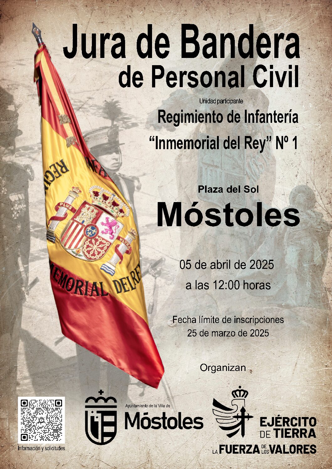 La Plaza del Sol de Móstoles va a acoger este sábado, 5 de abril, un acto solemne de Jura de Bandera para personal civil, organizado por el Ayuntamiento de Móstoles, junto al Regimiento de Infantería «Inmemorial del Rey» Nº 1 del Ejército de Tierra, a las 12:00 h.