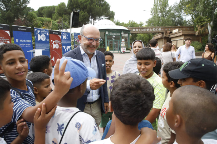 El Ayuntamiento de Madrid ha apoyado este verano el campamento ‘Vacaciones en Paz’, una iniciativa solidaria impulsada por la Asociación de Amigos del Pueblo Saharaui de Madrid que ha posibilitado el acogimiento temporal de 60 niños saharauis por parte de familias madrileñas durante los meses de julio y agosto. El delegado de Políticas Sociales, Familia e Igualdad, José Fernández, ha acompañado hoy a los menores en su visita al Parque de Atracciones de Madrid, la actividad que ha puesto el broche final a su estancia en la capital, que ofrece a estos niños de hasta 13 años un respiro de la compleja realidad que experimentan en los campamentos de refugiados en el desierto en los que residen en el Sahara Occidental.