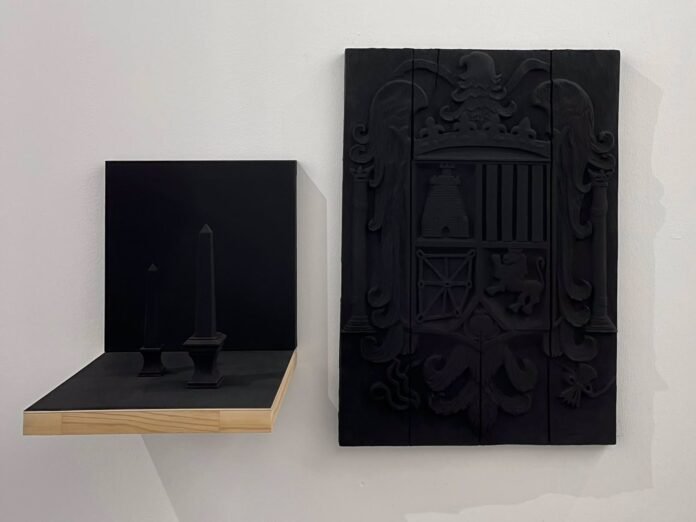 Una de esas piezas es ‘Damnatio Memoriae’, de Daniel Andújar, con un precio de 10.000 euros, que se encuentra en la galería 1 Mira Madrid. El artista aborda la «memoria histórica» en una pieza con un escudo franquista, tintado de negro, que ha acompañado con unos obeliscos, según comenta a Europa Press Enrique Berino, miembro de la galería.